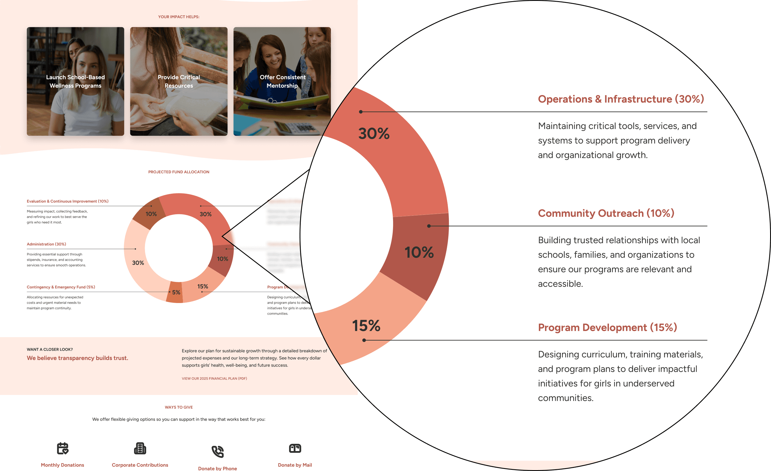 Dedicated donation page with secure payment options and projected impact transparency