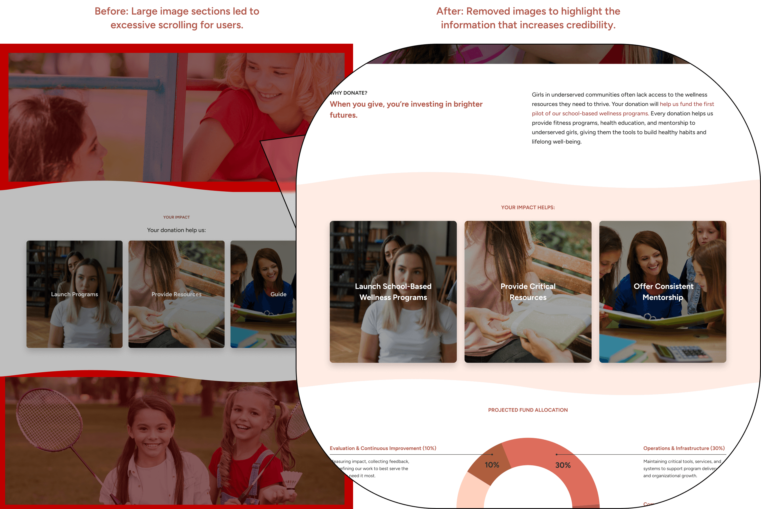 Early feedback revealed that users struggled to trust the site due to vague language and missing details. This led to a content-focused redesign that prioritized transparency and clarity: refining the foundation’s mission statement, detailing upcoming pilot programs, and tailoring the 'Your Impact Helps' section to clearly show how user involvement supports the community.